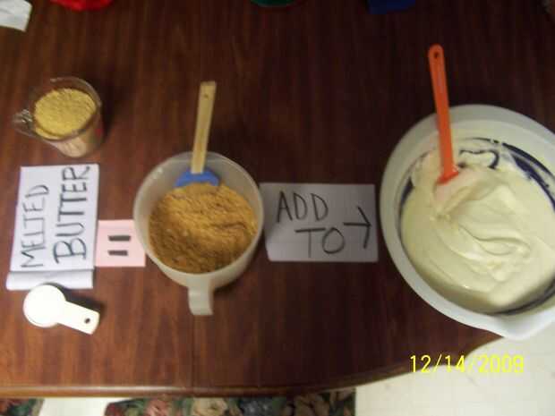 En un recipiente aparte mezclar galletas, el azúcar y la margarina derretida. Añadir esta mezcla a la ensalada-primer paso - con espátula de goma.