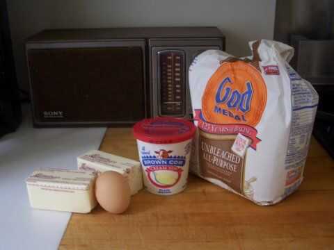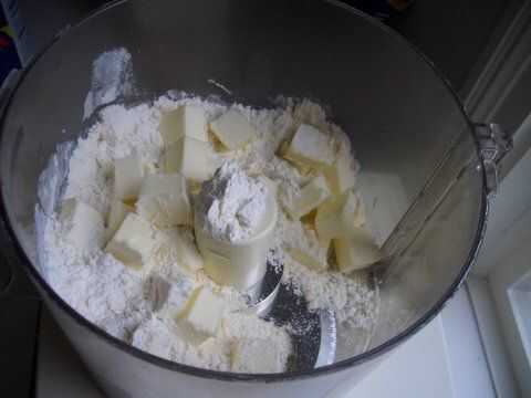 Para esta receta, tomar 2 tazas de harina, 11/2 cucharadas mantequilla y 1 cucharadita de sal y los pulsos en la cuisineart hasta que la mezcla se asemeja a un coarsemeal (ver foto). Luego agregue un huevo y 1/4 taza de yogur (preferiblemente no descremada) y formar una bola. Puede que necesite añadir un poco de agua para conseguir todo para permanecer juntos. Aunque es un poco grumosa, no te preocupes, eso es realmente bueno. Sólo recoger en abrigo de saran, aplastar una bola y ponerla en la nevera por una hora o así.