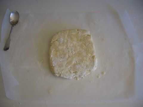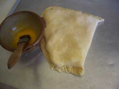 La masa de la nevera y aplastar en un cuadrado plano. Retire y corte la masa en dos trozos. Poner la mitad de la masa en papel de cera, iluminación polvo con harina (esto es mucho más fácil que usando un montón de harina sobre una tabla para picar). Poner otra lámina de papel encerado sobre la masa y estirar hasta que media un cm (?) delgada. Intentan formar en forma de rectángulo. En medio el relleno y flop sobre sí mismo para formar un bolsillo. Recortar los bordes y pellizcarlos cerrados. Si desea, puede hacer un bonito patrón de sangrado pequeño con una forma. No hay necesidad de empujar los agujeros en la masa. Hacer lo mismo a la otra mitad de la masa. Pincelar con yema de huevo y meter en el horno.