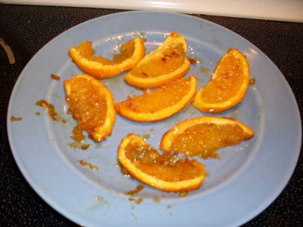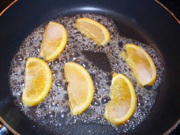 Este paso es muy fácil. Para caramelizar las rodajas de naranja, moje ambos lados de cada rebanada en azúcar. Luego ponerlas en una sartén acitronar que se ha puesto a fuego medio. Cocinar de un lado hasta que empiecen a conseguir un poco de color al color marrón de les, solo un poco dorado. Luego voltearlas y cocinarlas hasta justo antes de que color, cuando tienen apenas manchas de caramelizar a ellos. El primer lado es para el sabor y la textura, y la segunda es para la presentación. En total, sólo deberían tener que cocinar por unos minutos.