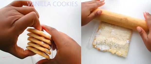 Coloque la bolsa sobre una superficie plana y triturar las galletas con un rodillo. Al rodar sobre las cookies - tenga cuidado de no perforar la bolsa.
