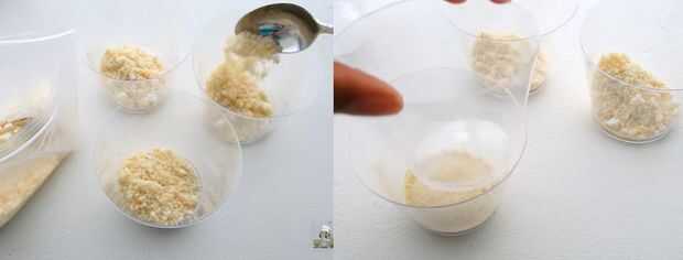 Coloque una cucharadita colmada de migas en cada taza. Colocar una taza extra dentro de las copas de postre. Presione firmemente para compactar las migajas y crear una costra. Si no tienes una taza que se adapta dentro de tu taza de postre, utilice el reverso de una cuchara.
