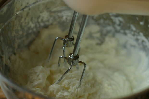 En otro tazón, batir la crema. Luego batir azúcar y queso crema.