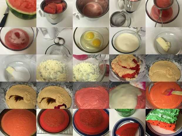 un pastel de sandía es una excelente manera de disfrutar este verano de postre. Refrescante y delicioso!Crema batida casera, espesa cubre una jugosa sandía madura y está adornada con sabrosos frutos secos y bayas. Este no hornear pastel no requiere c