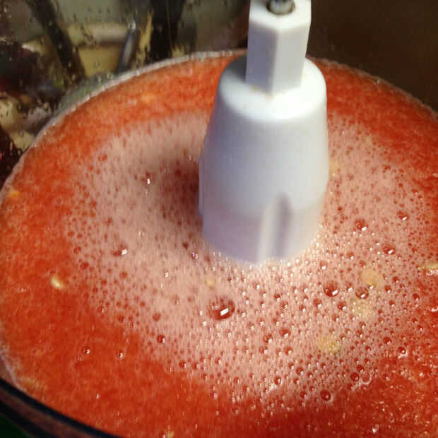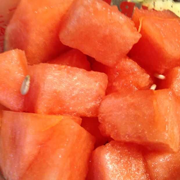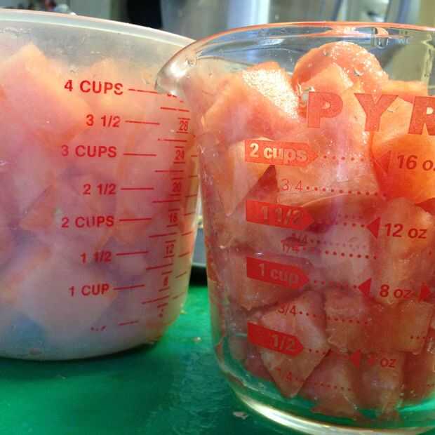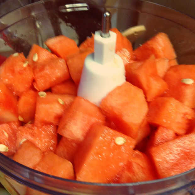 Cortar 6 tazas de sandía en cubos. Tomó cerca de la mitad de una sandía medio para mí, pero los tamaños varían, así seguir cortando hasta que ya tienes tus 6 tazas vale la pena. Colocar en la procesadora y procesar hasta que esté completamente mezclado.