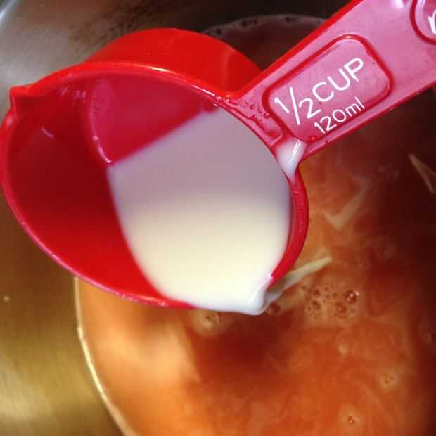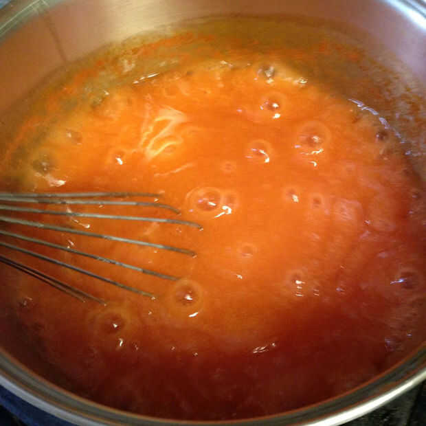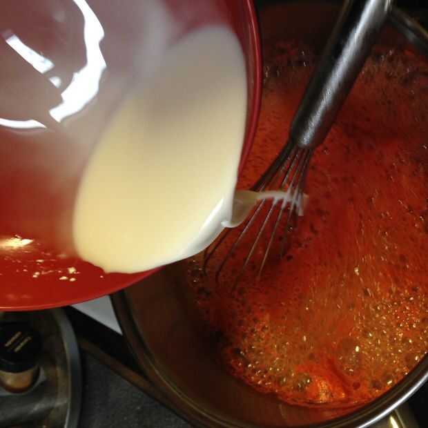 Añada 1/2 taza de leche al jugo de sandía. Caliente la mezcla de jugo de sandía sobre fuego medio alto y llevar a ebullición. Mientras se está calentando el jugo de sandía, crea una mezcla de almidón de maíz. Un tazón pequeño mezclar la fécula de maíz 1/2 taza con 6 cucharadas de agua, mezclar bien hasta que quede un líquido liso. Una vez que el líquido esté hirviendo, Vierta lentamente la mezcla en pt, mientras batir rápidamente. Continuar a batir hasta que el relleno haya espesado y la mezcla se ha incorporado.