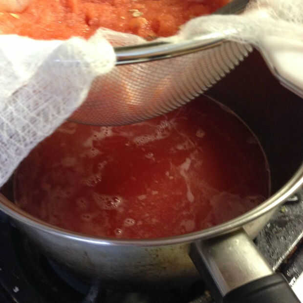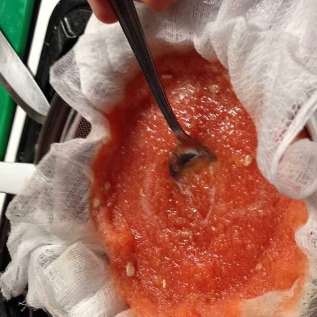 Línea el colador con una gasa y coloque en una olla mediana. Vierta el puré de sandía en el la coladera. Fuerza el jugo a través de la estopilla con una cuchara. Continúe hasta que todo jugo ha atravesado y sólo restos de la pulpa. Desechar la pulpa.