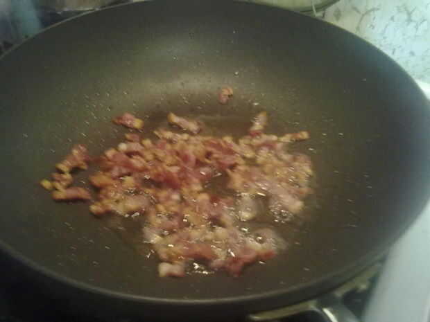 Primer paso: saltear tocino y grasa delicioso todo lo que fuera. Asegúrese de que el tocino esté súper crujiente! Vaciar el tocino y utilizar la grasa para saltear la pimienta (al gusto), ajo y cebolla. Como la cebolla cocina, añade los champiñones y cocine hasta que todo es una cortina de caramelizada marrón. Luego, enfriar a temperatura ambiente.