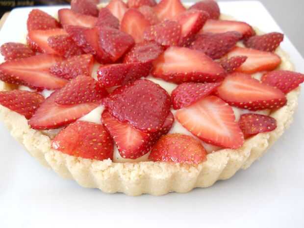 Este tarta de fresa era la receta de mi abuela. Es realmente fácil de hacer y la corteza es mi ir a la base de la tarta ya que pat sólo en el recipiente, sin necesidad de balanceo o riesgo de rasgado. Es delicioso, también.