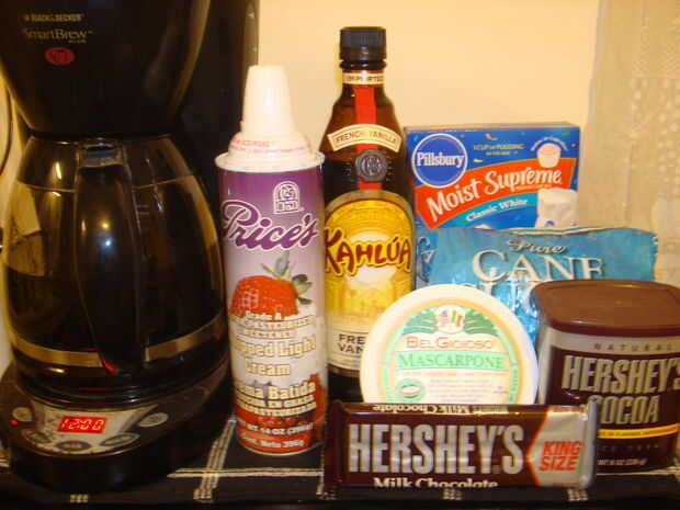 Nota: Vino de la receta original de: http://allrecipes.com/recipe/tiramisu-layer-cake/ modificado la receta para hacerlo rápido en un sujetador con lo que tenía en mano. La receta original lleva un poco más para hacer. Hice una torta rectangular y cortar formas de corazón de la torta para hacer las tortas individuales. También hice algunos con cubierta batida y algunas sin y yo personalmente le gustó mejor sin la batida. Si desea un sabor más fuerte de café agregar el café molido del pastel antes de que cuece al horno. Estaba fuera de esto así que lo omitió. Sin embargo es mejor con ella el pastel. El café molido también agrega color a la tarta.
