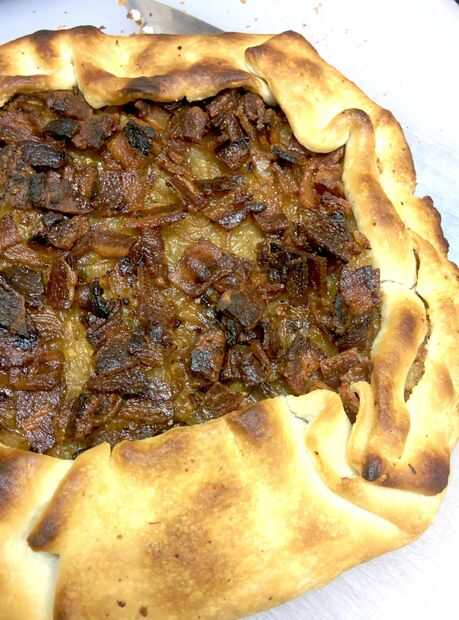 8. plegar los bordes de la masa (como artístico o rústica como te gusta) para cubrir aproximadamente 1/3 de las cebollas y el tocino.