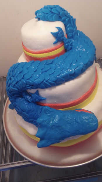 Para las decoraciones, uso caramelo alrededor de la torta y para la boca del dragón utiliza una pelota de goma grande. Añadir unos fuegos artificiales de masa sobre la torta.
