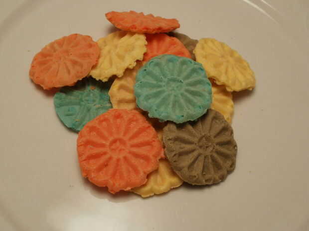 Para agregar alguna decoración de la tarta, hice galletas pizzelle que añadí colorante a. Para ver el método de cómo hice las cookies haga clic aquí I utiliza tijeras para cortar alrededor del diseño de la flor y coloca las galletas en la parte superior. Lo bueno de pizzelles es que mientras están aún tibias que puede hacer formas fuera de ellos!