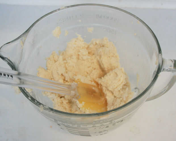 Con una espátula de goma, use movimiento plegable para mezclar, presionando sobre la masa hasta que la masa es un poco pegajosa y se pega junto.