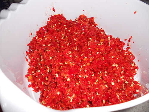 En un procesador de alimentos moler finamente los pimientos con el jengibre y dejar de lado