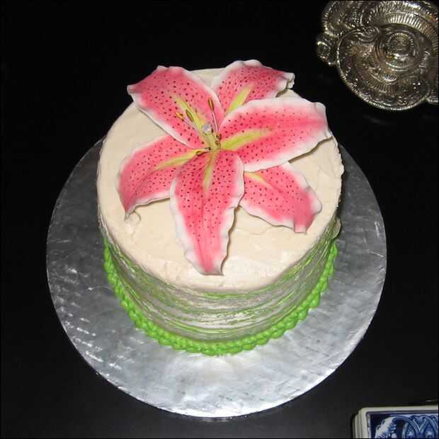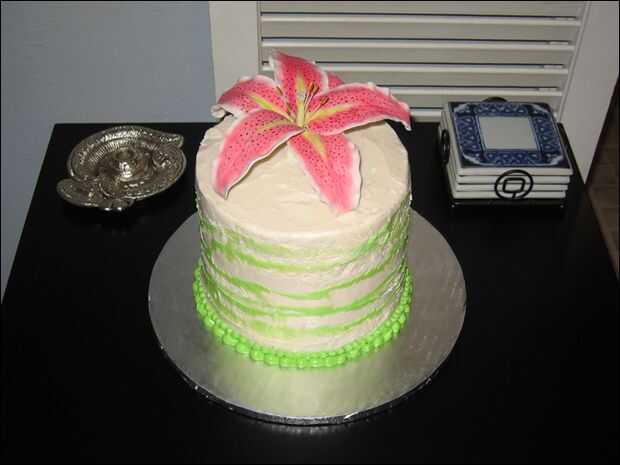 Es una capa de 4, 6" de Ronda, pastel de vainilla libre de gluten con glaseado de queso crema y una pasta de goma Lily Stargazer (su flor favorita). Fui con una helado áspera mirada que he estado viendo en tortas. También hizo la goma de pegar la flor. Fue mi primera vez goma de pegar flor para hacer y estaba tan contento con él y consiguió mantenerla. :) Estoy emocionado de probar otras flores, que va a hacer pronto.