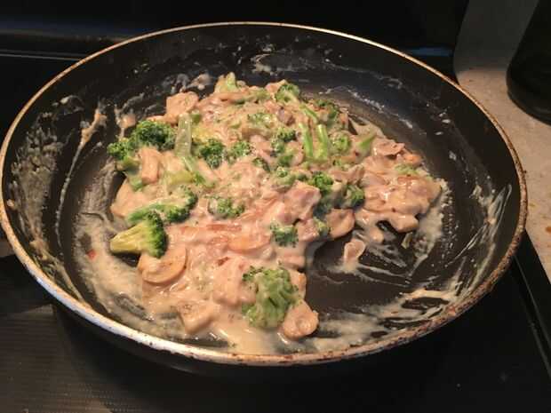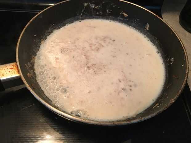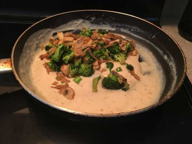 5) cuando la leche hierva y espese, añadir las verduras salteadas a la salsa. Comprobar de sal, especias (escamas del Chile) y añadir si es necesario.