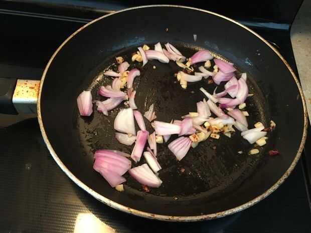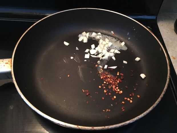 1) en un sartén, agregar mantequilla, escamas del Chile, picada de ajo, cebolla y saltear por unos minutos.