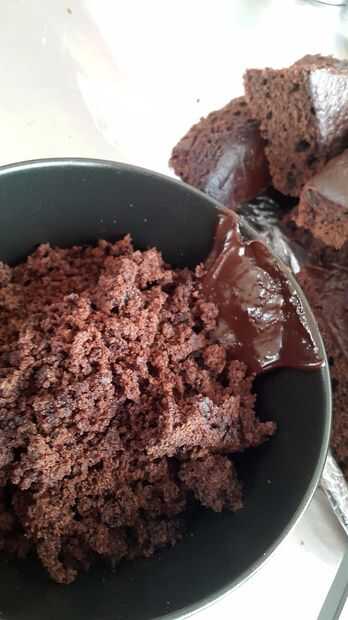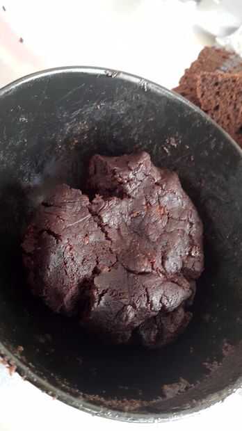 * Hacer la arcilla de la torta; por desmenuzamiento de los desechos en un recipiente con un poco de ganache. vamos a usar eso para la parte de la munición (parte media cilíndrica) ;D