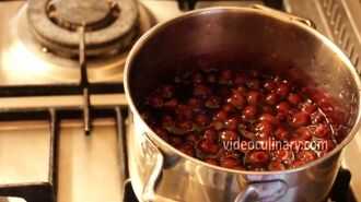 Combine el jugo de cerezas restantes con 300 gramos (11 onzas) de azúcar y lleve a ebullición. Lentamente bata la mezcla a la mezcla hirvienda y hervir por unos minutos, revolviendo frecuentemente. Apagar el fuego y agregue las cerezas escurridas. Enfríe por completo.