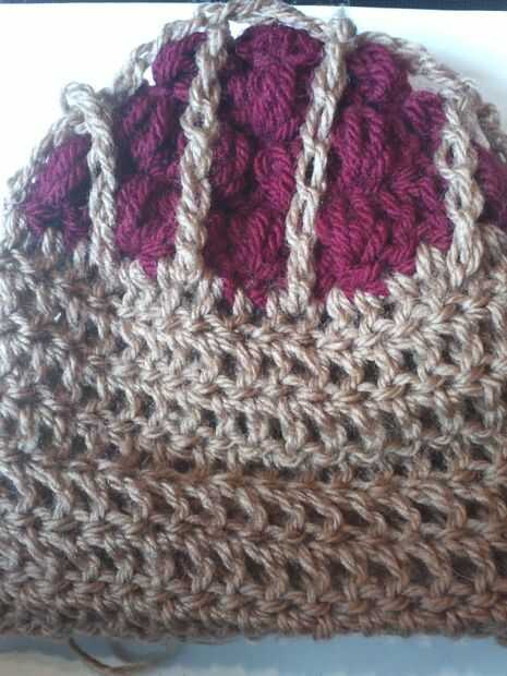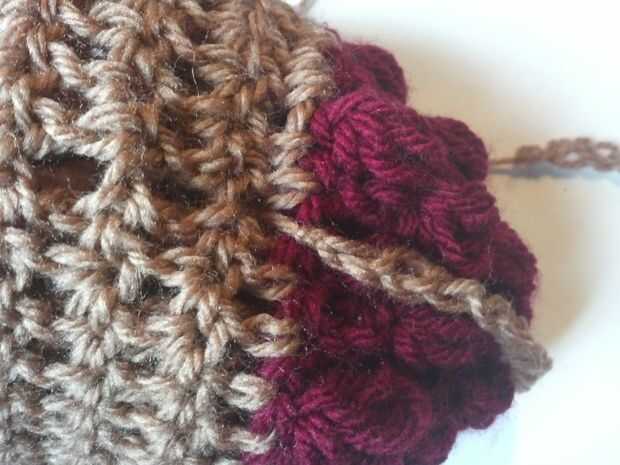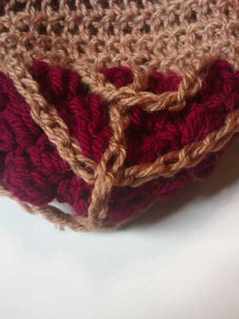 Coser en las cadenas para que se vea como una corteza de enrejado.  después de coser en las cadenas de la bobble cosido cadena justo debajo de donde el rojo puntadas terminado para que se vea como la corteza.