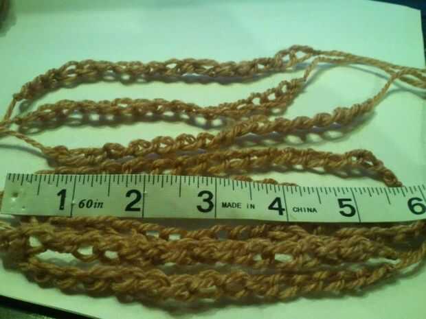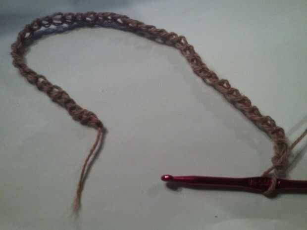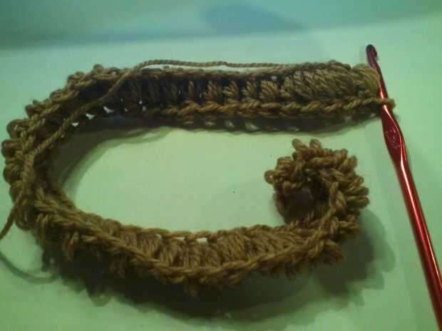 Cadena una cadena lo suficientemente larga para caber la circunferencia del sombrero y unos puntos extras de la cadena.   Al final de su cadena de vuelta y bobble stitch en cada puntada.