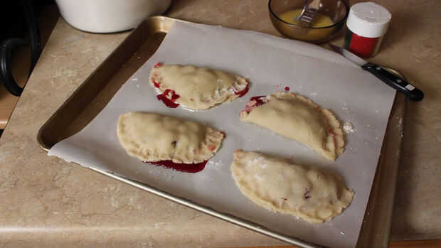 Repetir 7 veces más hasta que tenga 8 bolsillos de corteza de pastel relleno. Disponer las empanadas en dos hojas para hornear forradas con papel pergamino.