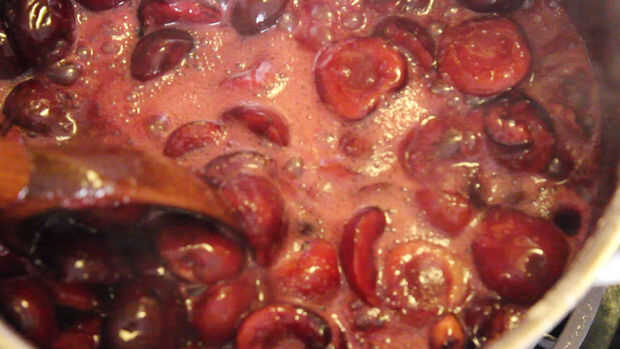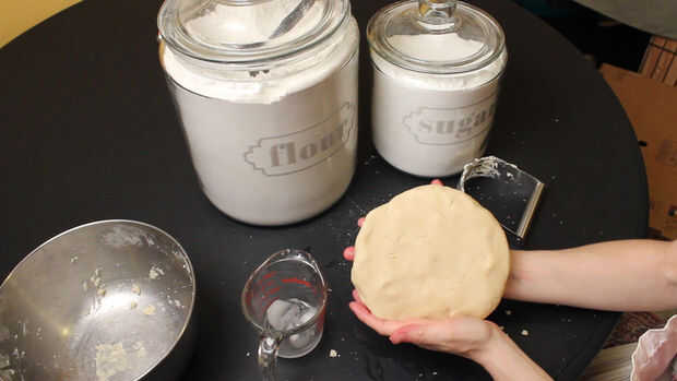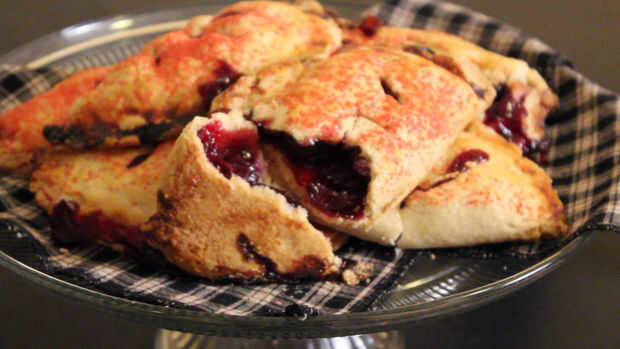 Enrolle cada pedazo en una bola y aplanar a un disco de 1/8" con un rodillo enharinado. Vierta aproximadamente 1/3 del relleno de pastel de cereza mano en el centro del disco.