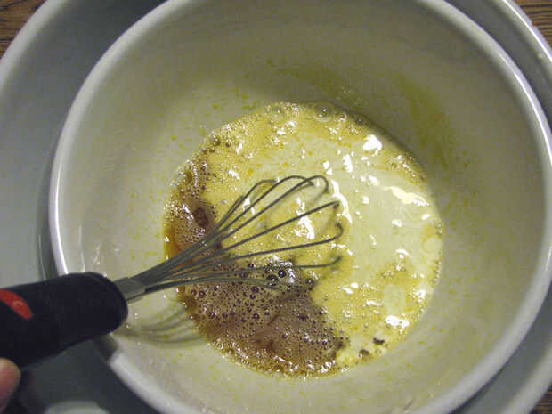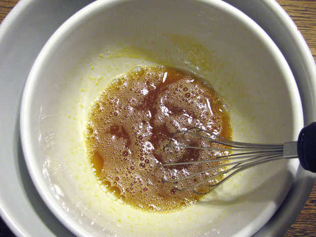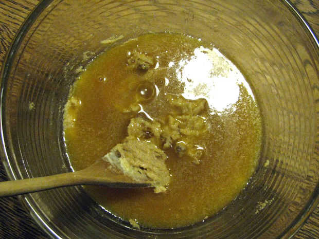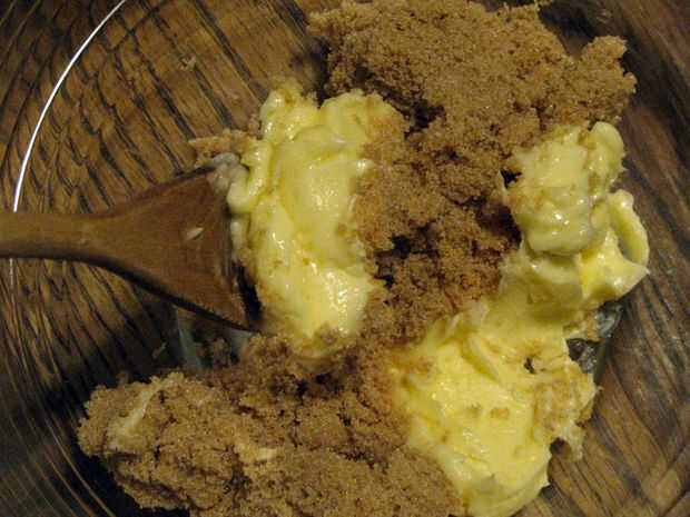 En una mezcla de tamaño mediano del tazón de fuente, crema azúcar morena y la mantequilla. En un recipiente mezcla mediana aparte, añadir el almíbar y colocar en un baño de agua caliente colocando el recipiente dentro de un cuenco más grande con una piscina de poca profundidad de agua caliente del grifo. En este mismo tazón de fuente con el almíbar, batir los huevos y el extracto de vainilla y luego revuelva la crema. Añadir la mezcla líquida a la crema de mantequilla y azúcar y revuelva para combinar. Agregue las pasas de uva o nueces.
