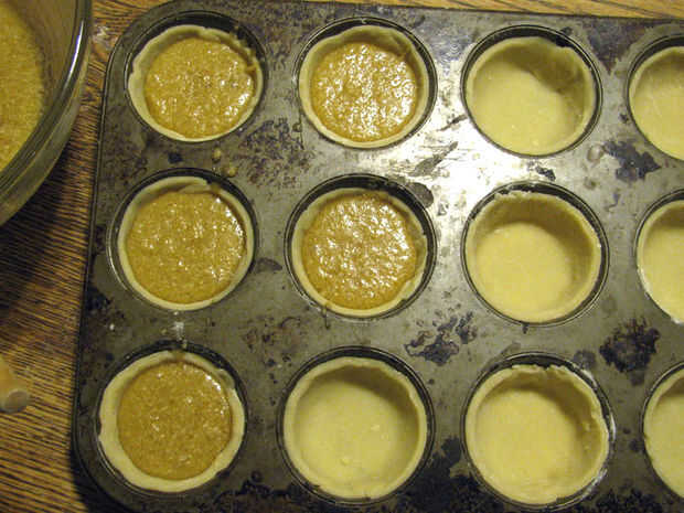 Quitar la corteza muffin forrada del refrigerador y cuchara en aproximadamente 2/3 - 3/4 completo con el relleno. Cocer en el horno durante 15-20 minutos. Centro debería ser inflado (se desinflará una vez enfriado) y burbujeante de los bordes.