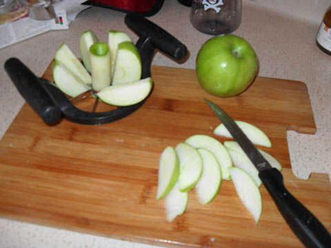 Utilice su descorazonador para cortar la manzana en secciones. Ahora toma las secciones y utilizar su cuchillo para cortarlas finas. No tiene que ser fina, pero evitar trozos gruesos para un aspecto pulido y acabado. Siempre corte alejado de su mano, a menos que tenga vampiros quienes salsa extra.