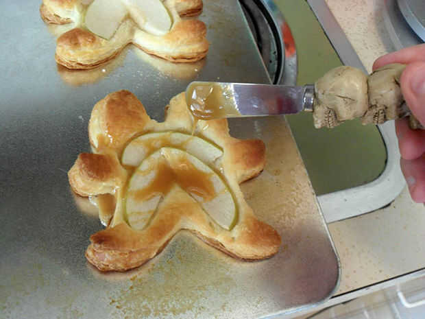 Sacar a tus gemelos del horno cuando los bordes estén dorados. Te darás cuenta que la masa ha soplado para arriba y algunas áreas pueden elevarse por encima de tus rebanadas de manzana. Que es de esperarse y no pueden interferir con la legibilidad de su forma.