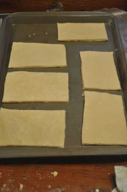 a continuación, paquete de la masa en dos bolas. Tomar una pieza de waxpaper y un poco de harina. Poner una bola de masa en el papel y luego otro trozo de waxpaper en la parte superior. Luego tome un perno de balanceo y rool la masa hasta obtener la masa fina. Luego, cortar rectángulos del tamaño de un Habbo. Realmente depende de cuán grande o pequeño desea la poptarts, pero no desea demasiado pequeño. Hice la mina aproximadamente 3 por 5 pulgadas. Pude hacer seis rectángulos (que hace 3 poptarts) con un poco de masa extra. También hice mi poptarts un poco grueso, porque quería un equilibrio de masa y relleno. Preparar una bandeja para hornear galletas ligeramente engrasado para que no se pega la masa de empanada. Luego, coloque el recorte rectángulos de masa aproximadamente la mitad una pulgada lejos de uno a.