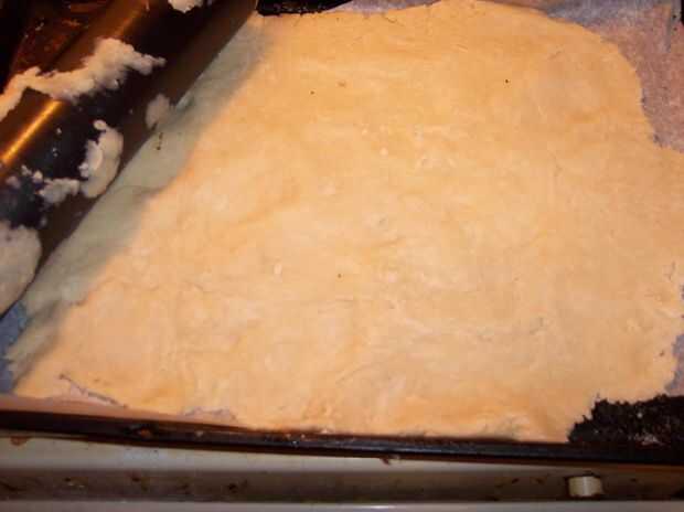 Línea una charola grande con papel de pergamino y la masa del rodillo en la bandeja para hornear galletas con un rodillo. Luego precalentar el horno a 350 grados.