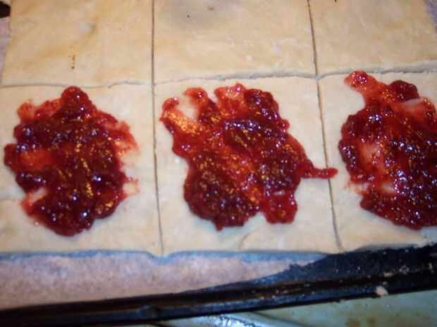 Con 2 cucharadas de tu mermelada favorita, Esparza uniformemente en el centro de cada cuadrado/rectángulo.