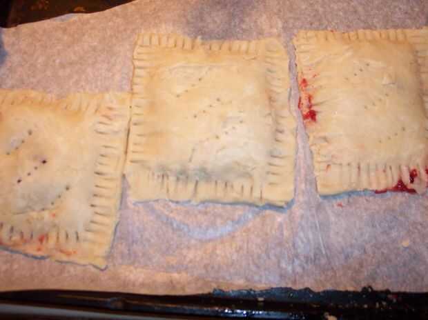 Con los rectángulos que no fueron utilizados encima la masa con la mermelada con la capa superior de la tarta. Utilice un tenedor para hacer intenciones en los bordes y meter la horquilla a través de la capa superior de la tarta de pop para hacer agujeros.
