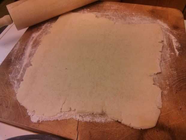 Tomar algunos harina y el polvo probablemente una superficie y un rodillo (o botella de vidrio si no tienes un rodillo). Extienda su masa hasta que quede aproximadamente 3 centímetros mayores de diámetro que la bandeja para hornear.