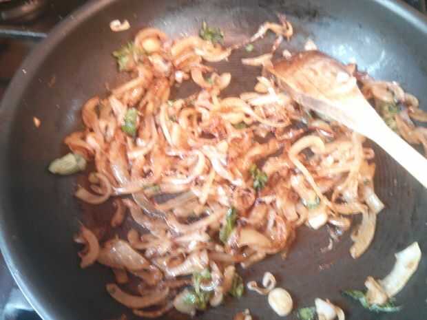 Entre aceite de oliva en una sartén y fríe ligeramente las cebollas hasta que estén doradas. Añadir cucharada de vinagre balsámico y cocine a fuego lento el líquido. Sazonar la cebolla con sal y pimienta al gusto.
