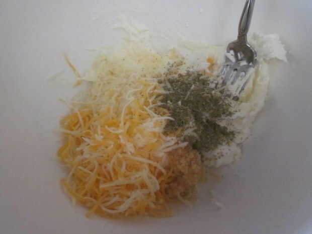 Añadir la crema agria, queso parmesano, reduce grasa italiano o mexicano mezcla de queso, ajo picado, hierbas secas mezcla italiano, ajo en polvo, copos de cebolla seca y sal y pimienta a la crema de queso en el tazón de fuente.