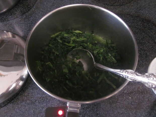 En una cacerola mediana poner la espinaca con una taza de 1/2 de agua congelada picada y poner en la placa de cocción a fuego lento hasta que las espinacas descongeladas y acaba de comenzar a cocinar abajo. El agua detiene la espinaca de coger en la parte inferior de la cacerola. Espinacas frescas pueden utilizarse también pero requiere cuidado lavar y picar antes de marchitarse en la cacerola. Cuando se cocinan las espinacas (frescas o congeladas) drene el exceso de líquido de las espinacas y deje que se enfríe un poco.