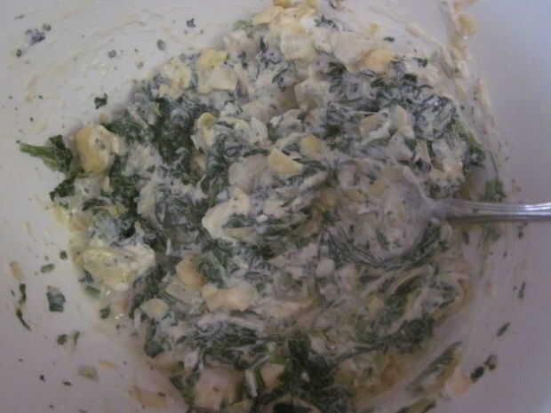 Añadir las espinacas y alcachofas a la crema de queso y otros ingredientes en el tazón de fuente. Remover el conjunto hasta que completamente mezclados.