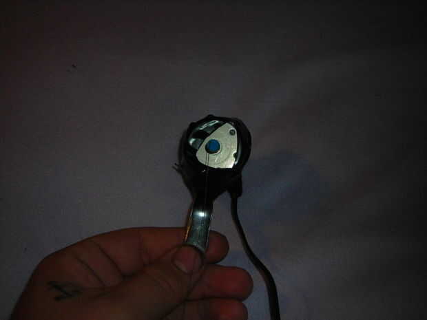 ahora pega el borrador tan cerca de centro muerto en la clavija pequeña del motor como sea posible. ahora corte la cuerda de su guitarra a cerca de 6 pulgadas y doblar uno de los extremos en forma de L sobre un centímetro abajo de la cadena. Luego necesitas tomar el extremo doblado y pegarlo en el borrador del centro como tal.