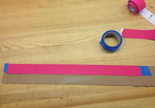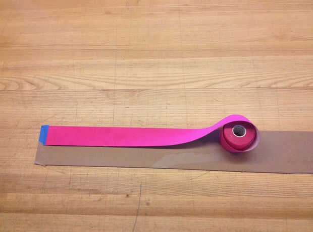 Empezar metiendo un extremo de su K-tape a la tira de cartón con cinta de los pintores. Asegúrese de que mantener el respaldo en el K-tape. A continuación estirar una sección de cinta K unas cuantas pulgadas más largas que su archivo del diseño y sellen el otro extremo con cinta adhesiva de pintores.