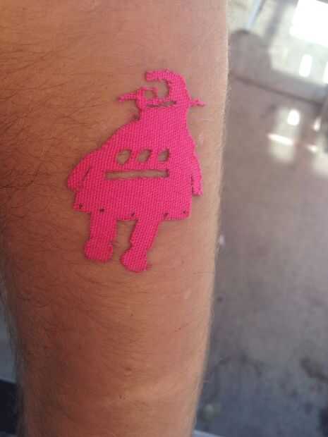 Tenga cuidado con la aplicación de la plantilla. K-tape es super pegajoso y también súper elástico. Demasiado se distorsionan su diseño y hacen difícil volver a aplicar una etiqueta engomada fresca en el mismo lugar exacto.