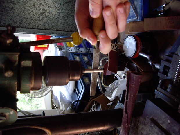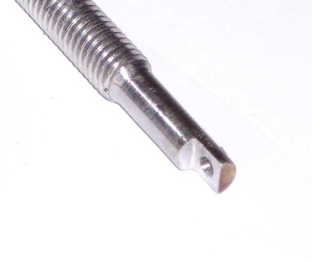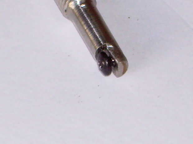 Una vez que esté satisfecho es decir puede resbalar en y hacia fuera el tubo libremente, es hora de empezar a crear el tornillo pasador. Esta es la parte que le permite tener las agujas intercambiables, para evitar infecciones y esas cosas. Firmemente colocar el mecanismo en un vicio y comienzan a presentar hasta que estés a la mitad de. Ahora buscar (supongo) el centro de la parte plana de la superficie le han creado y golpéelo con un clavo. Una vez que estés feliz con la colocación de la abolladura de su tiempo para encontrar un pequeño taladro del pedacito con un tornillo de coincidencia de tamaño. Taladre el agujero el intento el tornillo, tuve que pasar por varios tornillos, puesto que el metal era tan resistente mantienen matando a los hilos de rosca. Recomiendo el uso de un hilo de rosca cónica o algo más efectivo.