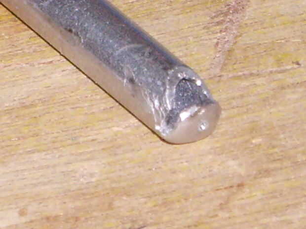 Presentar el extremo del tubo hasta que el camino se pasan mitad de camino, dejando una placa de metal que sobresale. Moler un tornillo o algo realmente no importa hasta sus afilados, entonces martillo a través de la pieza de Tebas que queda de la presentación. Esto debe salir de un agujero pequeño para caber a través de la aguja. Luego doblar la placa contra el tubo de modo que crea un cierre para el tubo * Asegúrese de dejar una abertura para verter la tinta a través de!