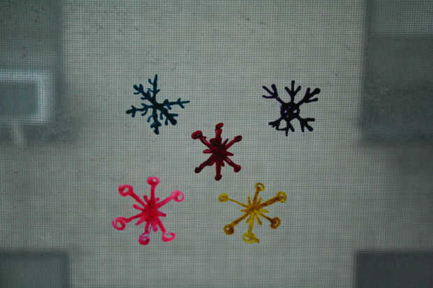 un juguete decorativo basada en el movimiento de deslizamiento de palo. El copo de nieve de madera se une por un resorte a una manga de madera que en una barra de metal. Deslice el copo de nieve en la parte superior de la varilla, y con un toque de