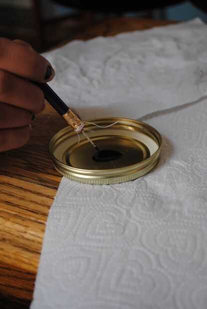 a continuación tomar la tinta y poner un poco en una tapa de frasco. El tomar la cadena envuelto aguja y sumerja la punta en la tinta que allí una buena cantidad. La cadena actuará como una mecha así.