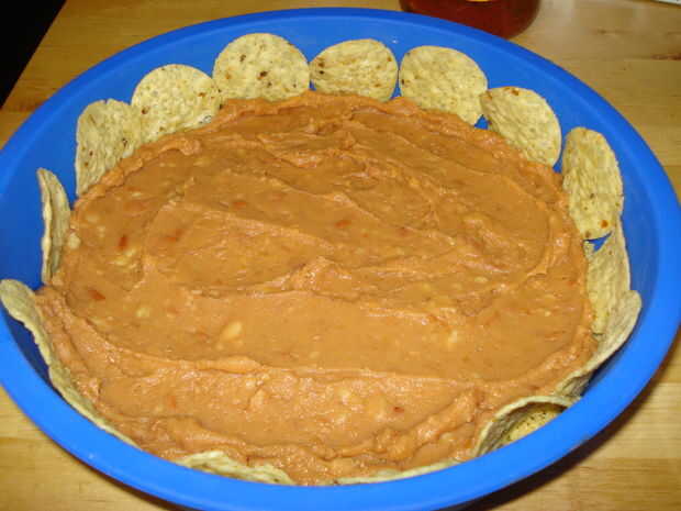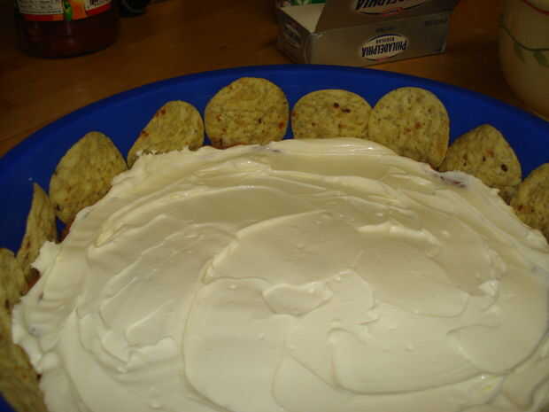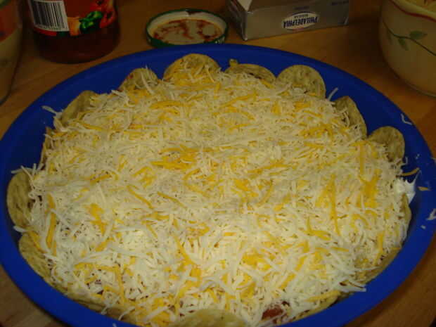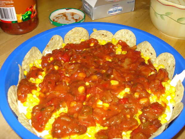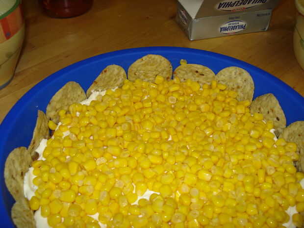 Aplique una capa de frijoles refritos en la corteza. Nota: Tenga cuidado al separarse los frijoles si no había precocido la corteza. Los granos pueden tirar un poco de la corteza. A continuación, extender la crema de queso sobre los frijoles (puede que necesite ablandar el queso crema o utilizar una variedad batida). Escurrir la lata de maíz y el maíz encima de la crema de queso de capa. Luego agregar una capa de la salsa sobre el maíz. Por último, espolvorear todo con una buena cubierta de queso.