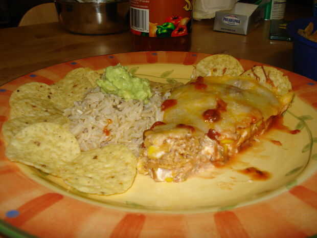 Servir con una parte de arroz y un poco de guacamole. Unos totopos extra y un chorrito de salsa completa la presentación.